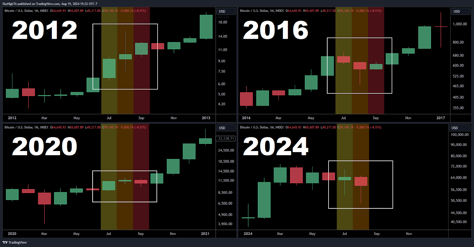 Я объясню. Это ценовое дно соответствует историческим тенденциям, наблюдавшимся всегда накануне выборов в США. Так в 2012, 2016 и 2020 годах, когда выбирали американских президентов, биткоин неизменно достигал своего локального минимума в третьем квартале. Но затем следовал сильный восходящий импульс, который часто приводил к ценовым ралли и новым рекордным максимумам после  выборов.